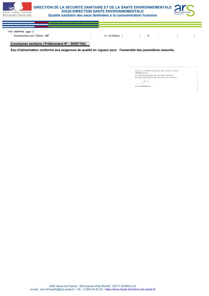 Eau d’alimentation conforme aux exigences de qualité en vigueur pour l’ensemble des paramètres mesurés.